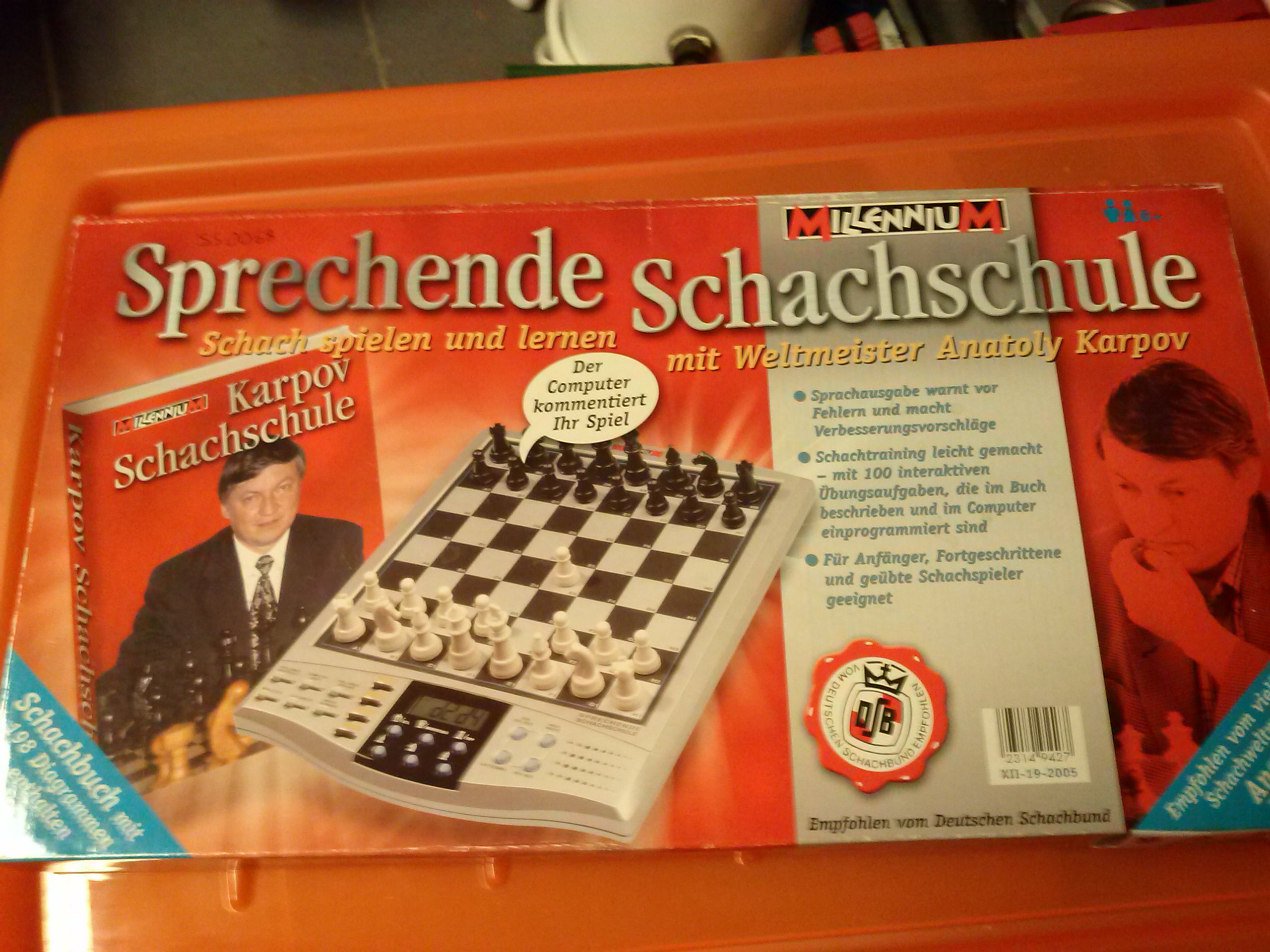 Kategorie: Sport & Spiele Beschreibung: Sprachausgabe warnt vor Fehlern und macht Verbesserungsvorschläge mit Schachfeld und Figuren Regal: 13 Datum hinzugefühgt: 2016-12-29 Objekt verleihbar